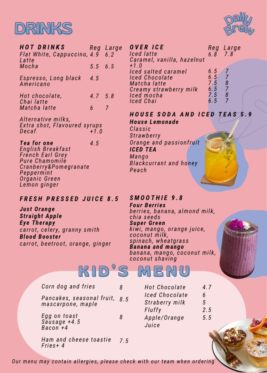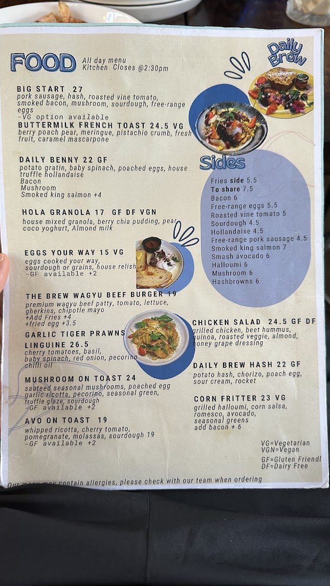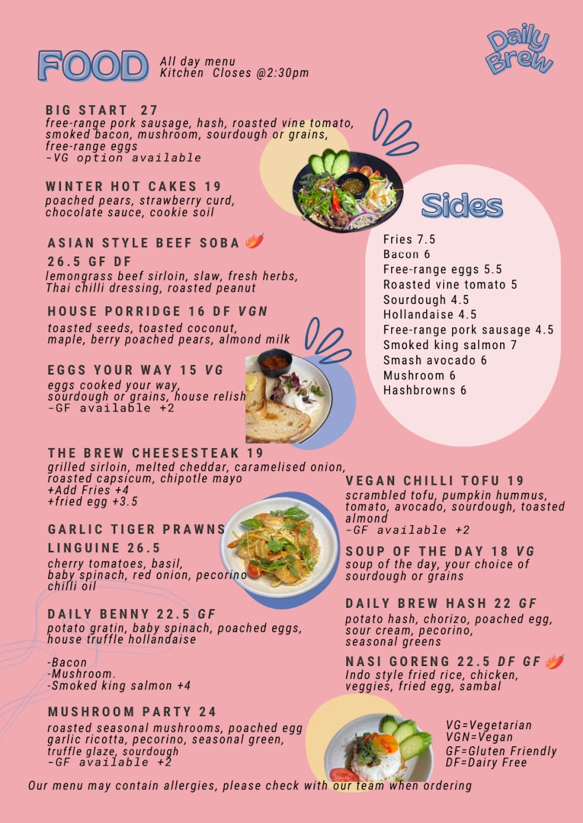 Welcome to Daily Brew, a charming café tucked away in Meadowbank, Auckland, where cozy vibes meet a delightful menu. The culinary offerings here are designed to cater to various tastes, from heartwarming breakfast options like the Big Start and Daily Benny to comforting lunch staples like Asian Style Beef Soba and Garlic Tiger Prawns Linguine. Each dish is crafted with love and perfect for a casual dining experience.